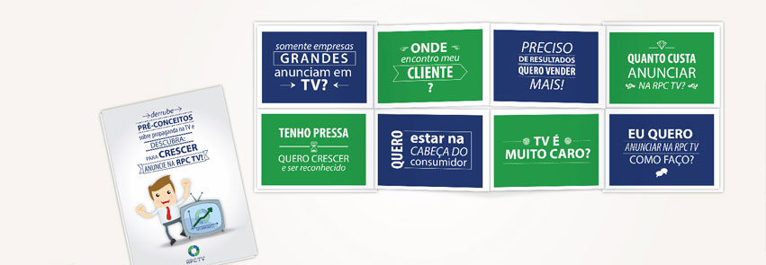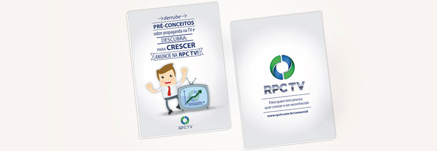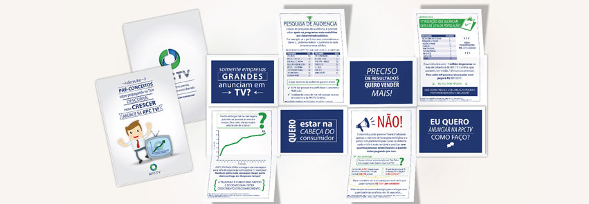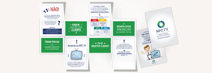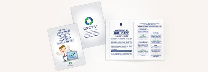 Recebi da RPC o desafio de elaborar um material destinado à venda de espaços comerciais em sua programação para médias e pequenas empresas. O material teria que ser atraente e de baixo custo de produção. Após estudar o conteúdo enviado, propus uma nova linguagem, mais direta, clara e com bastante gráficos para facilitar o entendimento. A faca (corte) faz com que ao abrir o folder o leitor encontre vários questionamentos sobre anúncios em televisão. Ao levantar cada recorte com a pergunta o leitor encontra a resposta no recorte de baixo. Lá ele pode esclarecer suas dúvidas e constatar as vantagens e o custo/benefício do anúncio televisivo da sua marca.
