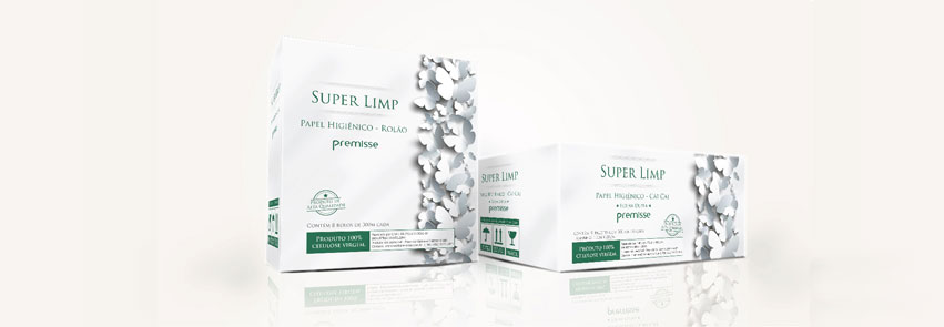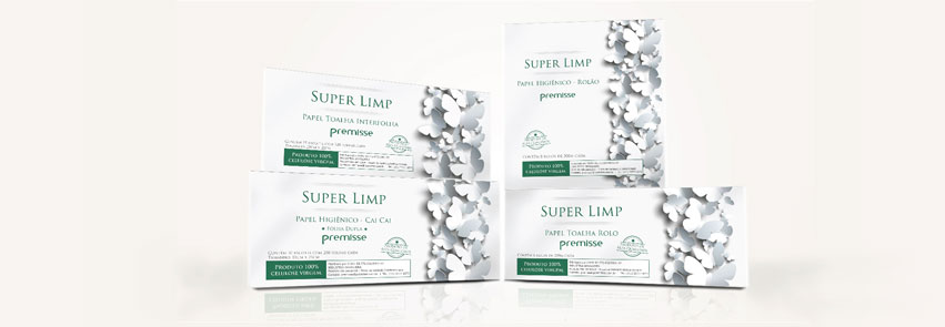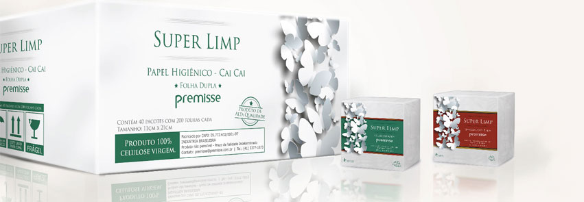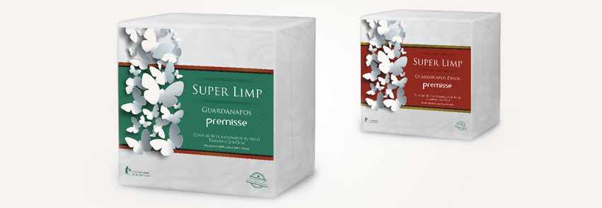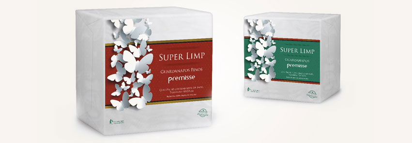 Trabalho em parceria com a Premisse há vários anos, desenvolvendo principalmente embalagens para seus produtos. O último trabalho que fiz para a empresa foi a criação de uma marca para a nova linha de papéis da empresa e também a criação da embalagem. A linha “Super Limp” contempla os produtos: papel higiênico em rolo, papel higiênico no formato cai-cai, papel toalha interfolhas, papel toalha rolo e guardanapos.